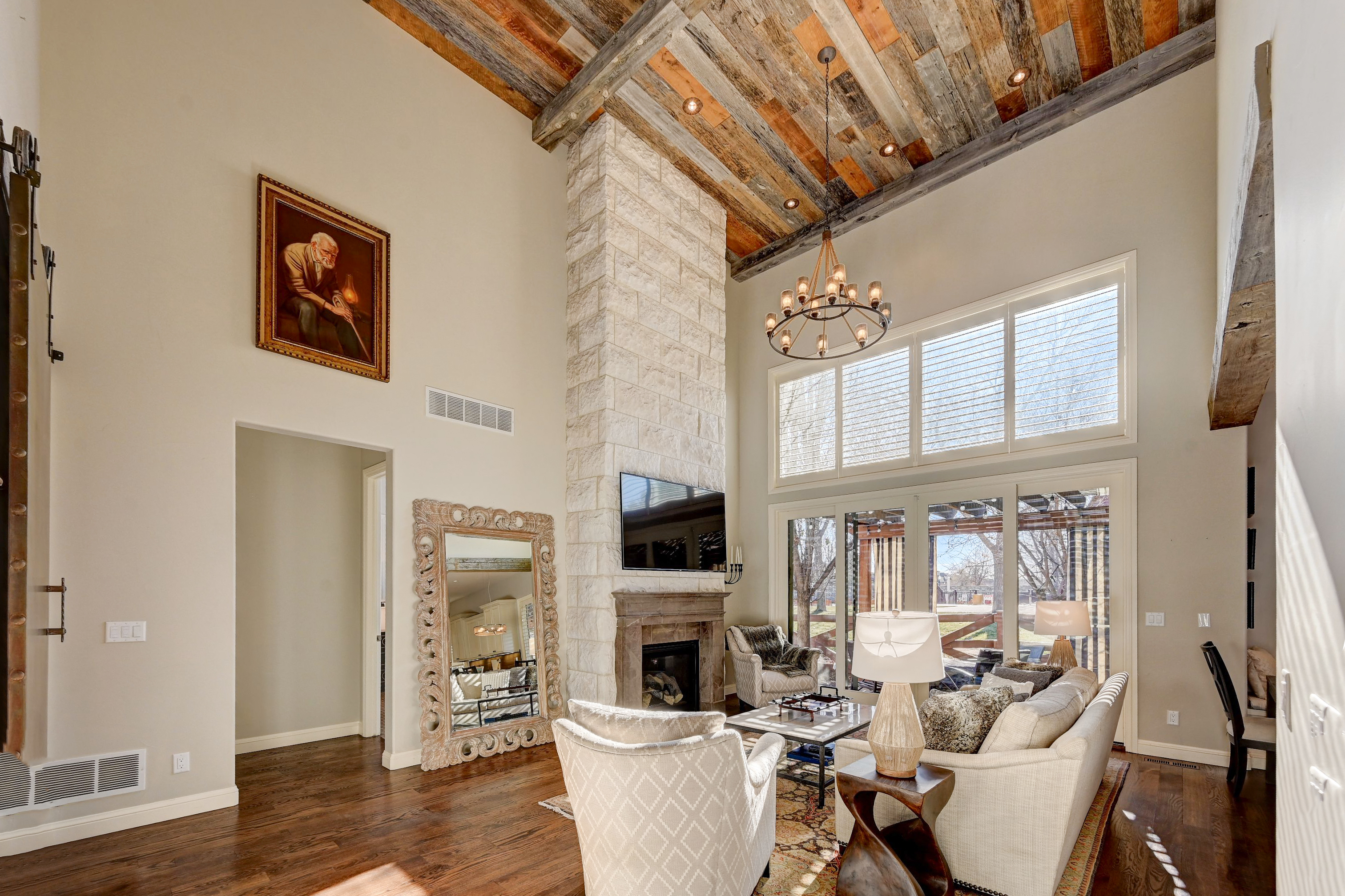 Inside, the home showcases rich hardwood flooring, premium quartzite surfaces, artisan lighting, curated hardware and layered textures that give every room a tailored, custom feel. The open great room stands at the center with a reclaimed wood tongue-and-groove vaulted ceiling, exposed beams, industrial barn door detail and a dramatic floor-to-ceiling stone fireplace that anchors the space. Oversized doors extend the room to a heated, pergola-covered patio wrapped in lush landscaping for privacy, creating an easy indoor-outdoor flow that buyers look for in Denver golf course homes.